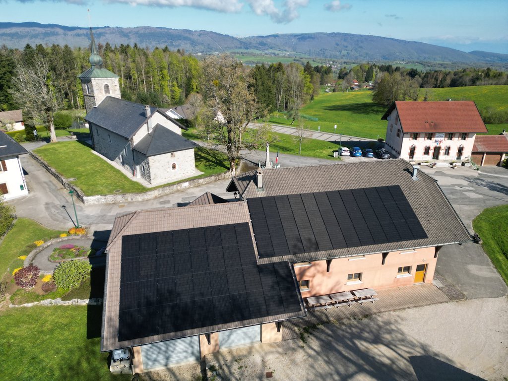 Début 2025, l'entreprise Energies Services France, basée à Saint-Pierre a été retenue pour couvrir la toiture sud-est de panneaux. En utilisant un principe de batterie virtuelle (le surplus produit en été est récupéré en hiver), l'installation a été dimensionnée pour couvrir les besoins annuels de la salle. Ce sont donc 72 panneaux de 500 watts qui ont été installés au printemps pour une puissance totale de 36 kWc. Afin d'être exemplaire, la commune a choisi d'installer des panneaux français de l'entreprise Voltec en Alsace. Certes un peu plus cher que les chinois, mais plus responsables. Le coût de l'opération se monte à 35'900€ HT, financés à hauteur de 7'180€ par le Département de la Haute-Savoie au titre du CDAS. L'investissement devrait être rentable entre 5 et 6 ans. Nous remercions le Département de la Haute-Savoie pour son soutien.